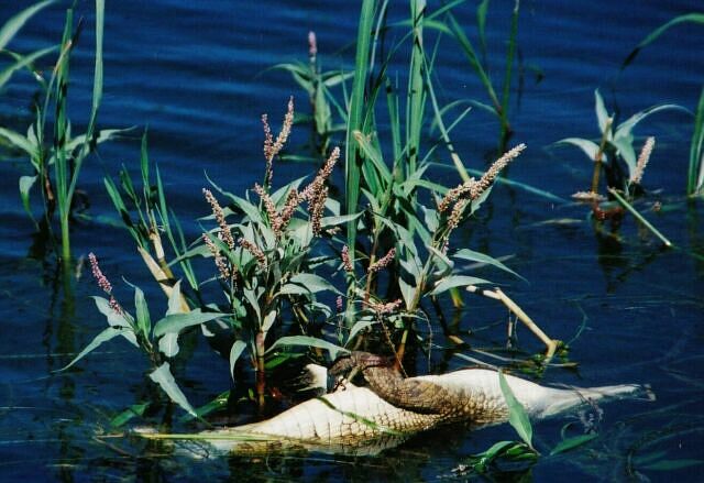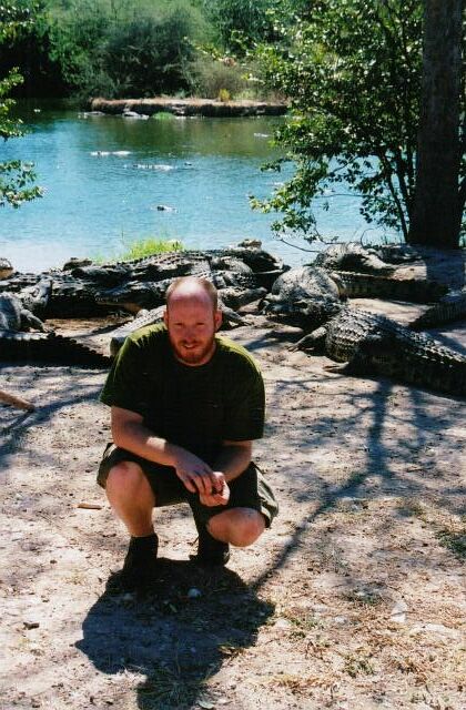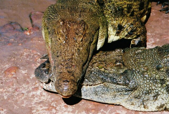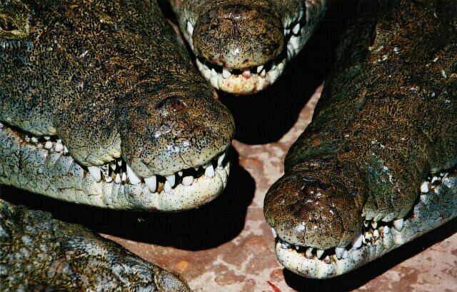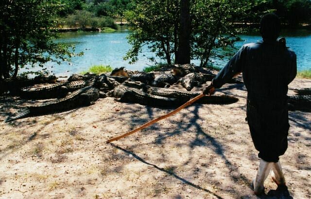 | These pictures are all from a few days spent on a boat on Lake Kariba. Mostly from what claims to be the world's biggest crocodile farm, with 80 to 90 thousand crocs. For a few bucks you can go on a feeding, and even get out with the animals. No need to worry, there's a guy with a stick to fend them off should they get nasty. Later on with the cheetahs, and again with the ragged tooth sharks, I found out a stick seems to be considered adequate defence against most predators in Africa. |