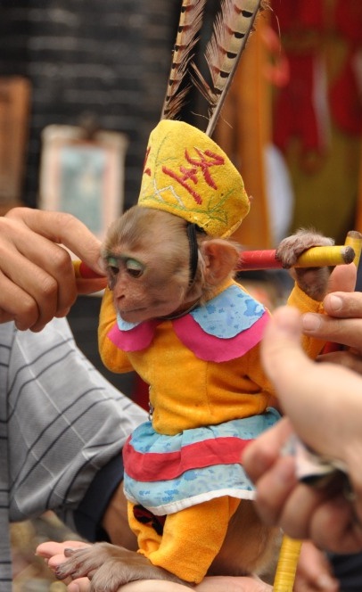 Dressing up the monkey makes perfect sense, but green eye shadow. I shudder to think what that monkey is made to do after dark. I also wonder what goes through its handlers head every morning as he wakes up, gets his coffee, and starts applying makeup to his monkey.